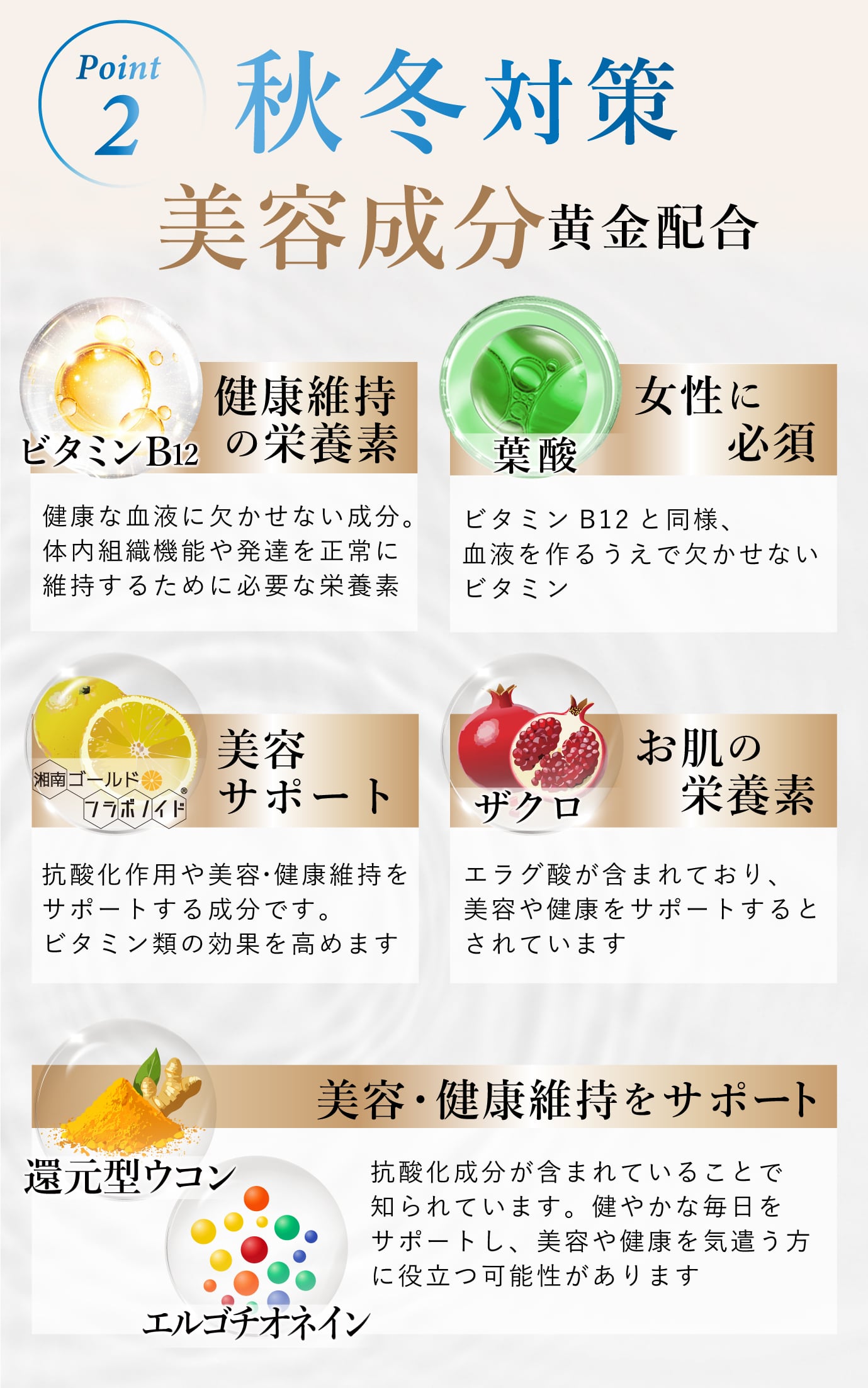 女性には欠かせないヒアルロン酸、葉酸、ビタミンB12に加え、新たにザクロエキス、還元型ウコン、エルゴチオネインを配合しました。