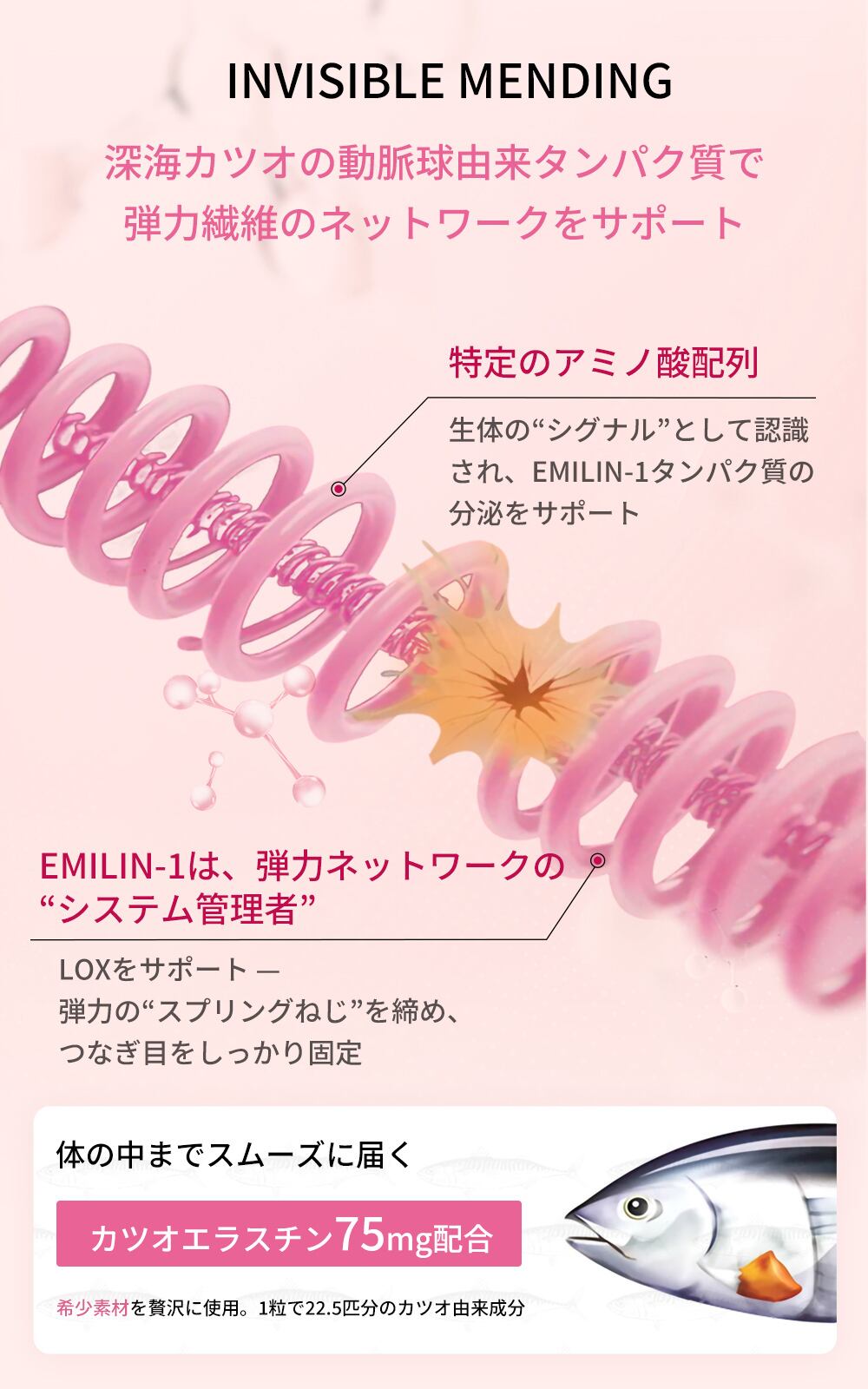 本品は、国産のカツオ動脈球から抽出した高純度エラスチンを中心に、
